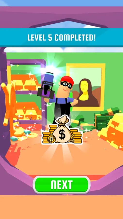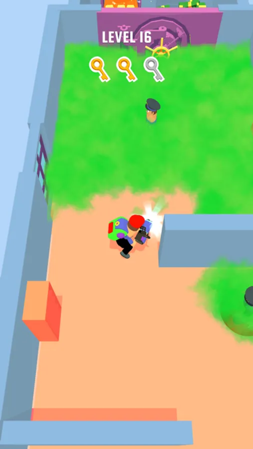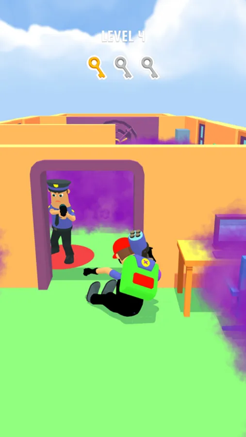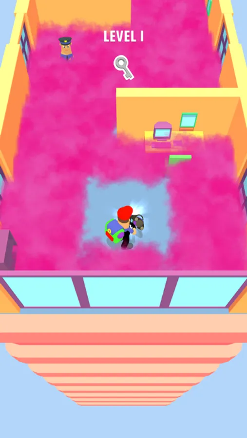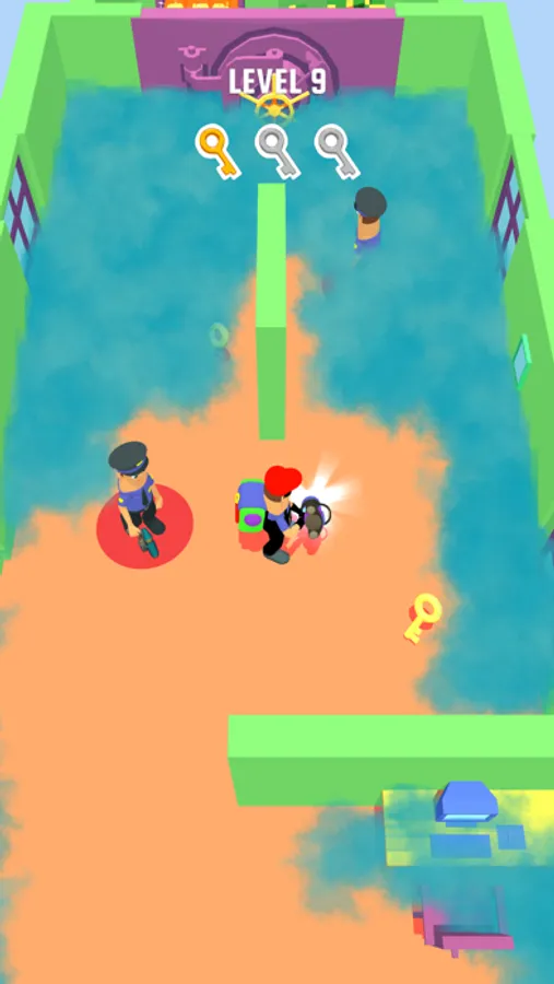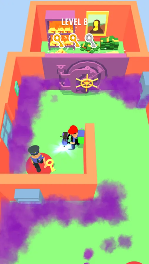 Collect all the keys and walk towards the bank vault under colorful fogs.