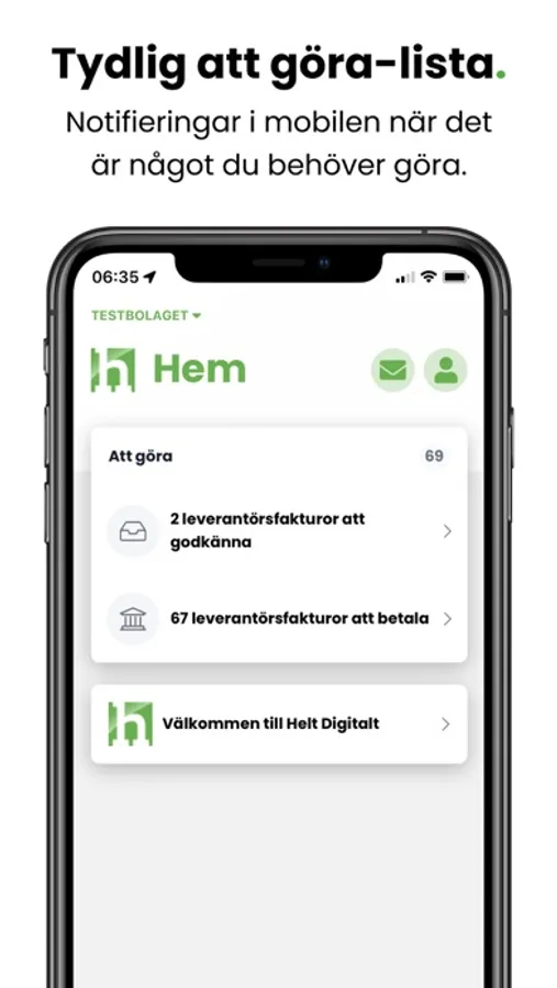 Med Helt Digitalt får du pushnotiser och aviseringar om viktiga saker du behöver göra eller känna till. Du kan skapa, skicka och följa upp dina kundfakturor. Du kan också fota och skicka in kvitton och andra underlag samt registrera kassarapporter.