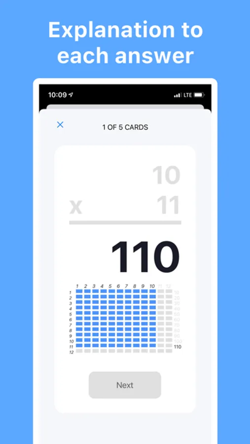 This free app features random questions with factors that go from 1 to 12. Its simple design has multiple-choice answers. Each problem has a variation (like 9 x 3 and 3 x 9), so you can practice both kinds! When you get a problem right, the card flips over and gives you a visual explanation. If you get a problem wrong, it lets you know and you can try again.