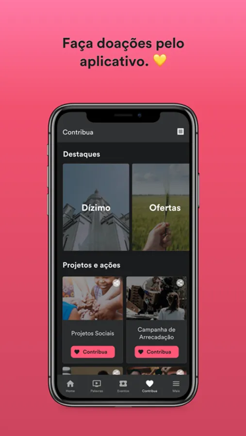 - Doe ou contribua com a igreja diretamente pelo aplicativo através de cartão de crédito ou boleto.