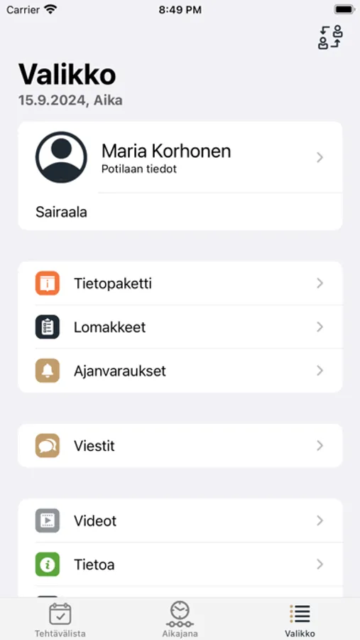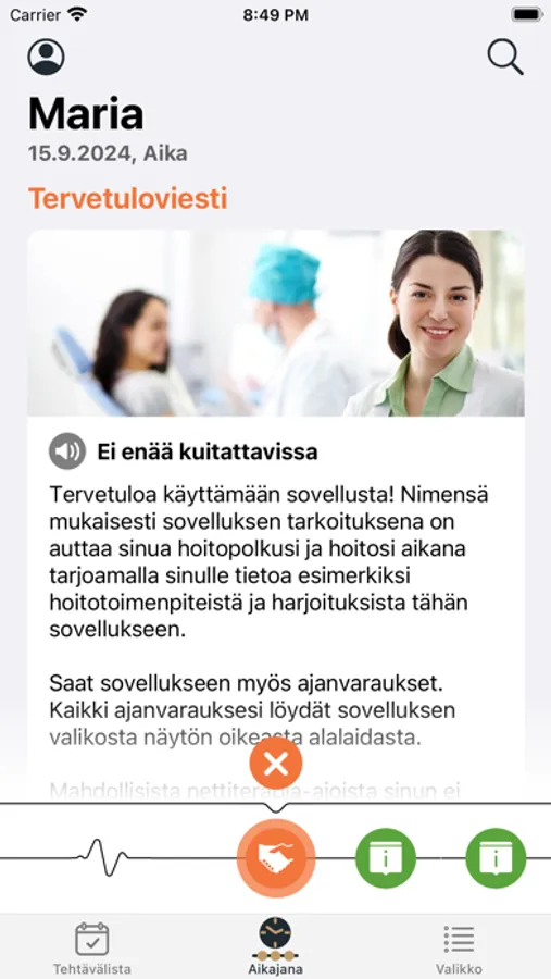 Recuror-sovellus tarjoaa käyttäjälleen kaiken tiedon hoitoon liittyen helposti ymmärrettävässä muodossa. Aikajanalta potilas voi nähdä hoitoonsa liittyviä tapahtumia ja tehtäviä ja kuitata ne suoritetuiksi.