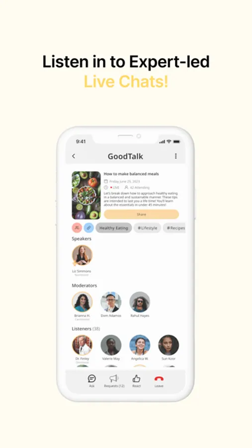 LEARN FROM THE EXPERTS - GoodTalks are interactive live audio chats – led only by vetted Experts - that create a space for Experts and Users to engage in meaningful conversation and interact with their communities. Live chats can take the form of info sessions, Q&As, panels, and more.