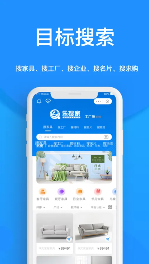 “乐搜家”家居供应链数智化服务平台,以技术驱动为核心“集产业+大数据+数字化+智能营销”全面赋能B端客户需求提供解决方案。精准匹配、高效成交、担保交易、及时交付、物流仓储、到家安装、售后保障等。