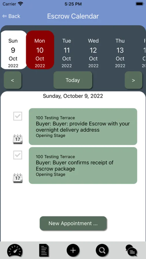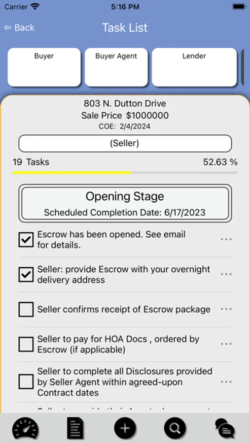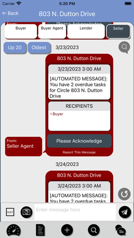 All action task items are flagged in the app via a set escrow timeline. Circle notifies the responsible party or parties via an alert that there is a task requiring their immediate attention or is past due. With the tap of a screen, each party acknowledges receipt of each communication and task completion. Circle timestamps each party's acknowledgement of each action item and tasks. When escrow closes, all parties including the Broker can download a PDF of the entire Circle communication thread and add it to their transaction file as a complete record.
