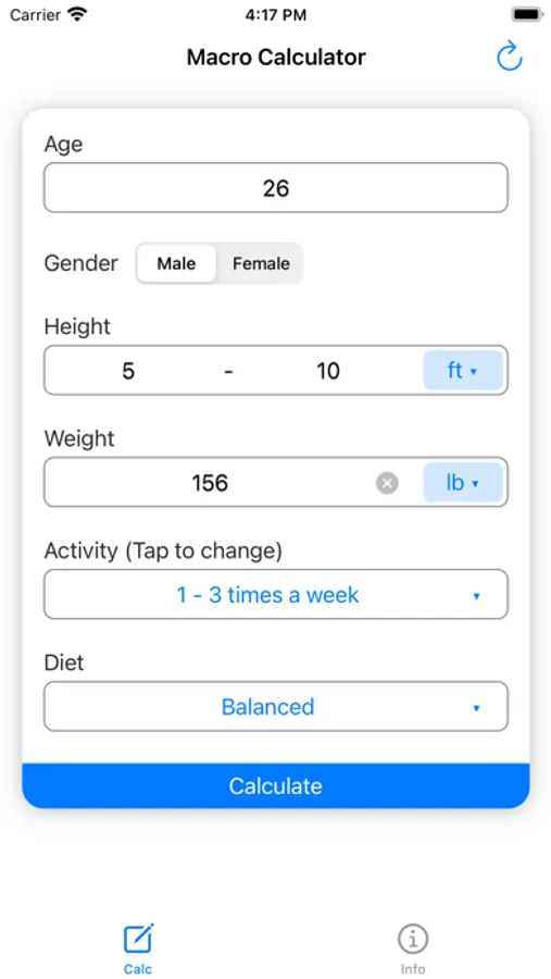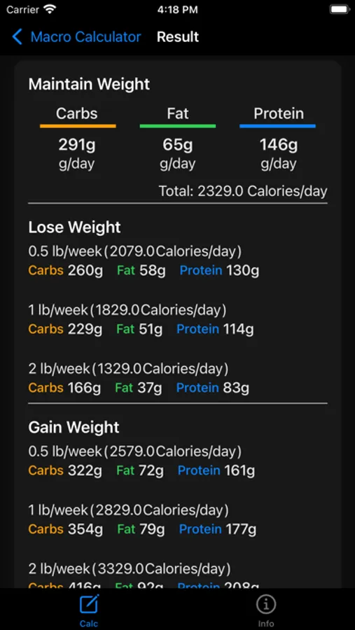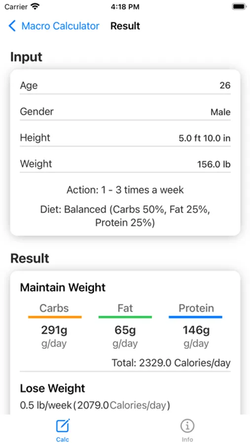 Use this App to calculate the amount of Carbs, Fat, Protein and total calories a person needs to consume per day. We also provide the amount of Carbs, Fat, Protein and total calories needed to gain or lose weight according to specific weight gain and loss per week. This is a very intuitive, simple and easy to use application.