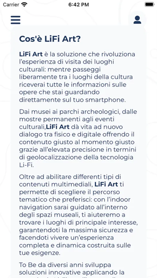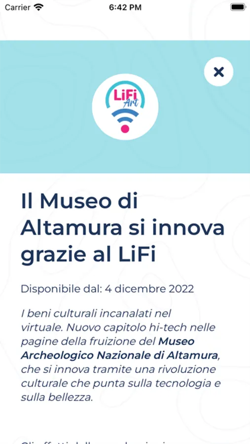 Dai musei ai parchi archeologici, dalle mostre permanenti agli eventi culturali, la nostra soluzione propone un nuovo dialogo tra fisico e digitale grazie alla luce del Li-Fi. Scarica l’App, posiziona il tuo smartphone sotto il fascio di luce LED e lasciati guidare tra storia ed arte dalla luce dell’innovazione.