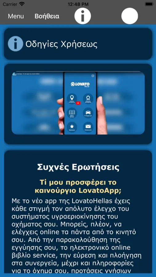 Με το νέο app της LovatoHellas έχεις κάθε στιγμή τον απόλυτο έλεγχο του συστήματος υγραεριοκίνησης του οχήματός σου. Μπορείς, πλέον, να ε΄λέγχεις online τα πάντα από το κινητό σου: από την παρακολούθηση της εγγύησής σου, το ηλεκτρονικό online βιβλίο service, την εύρεση και πλοήγηση στα συνεργεία , μέχρι και πληροφορίες για το όχημά σου, προτάσεις γνήσιων ανταλλακτικών, επικοινωνία απευθείας με την LovatoHellas, ενημερώσεις, χρήσιμες πληροφορίες και πολλές ακόμα υπηρεσίες. Κατεβάζοντας την εφαρμογή LovatoApp έχεις ανεπανάληπτα προνόμια, όπου κι αν βρίσκεσαι, κάθε στιγμή!