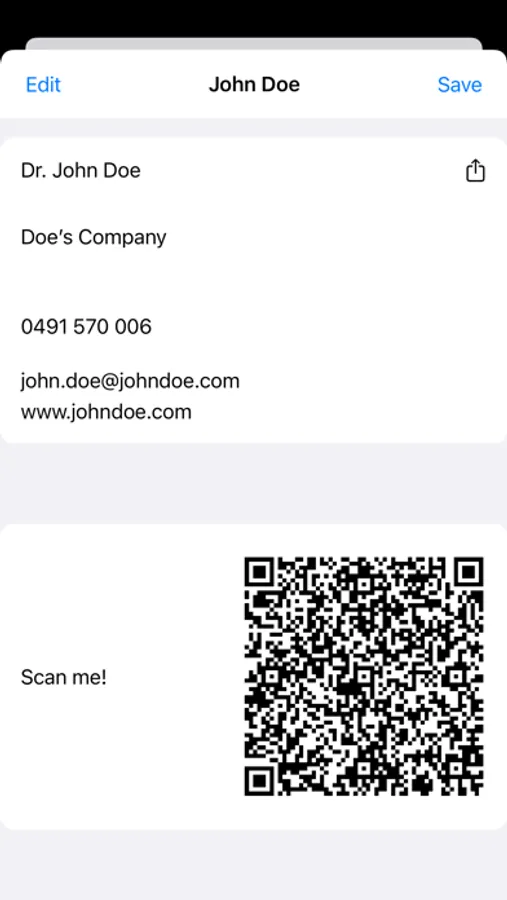 - With the QR code your business partner can easily and quickly save your business cards in his contacts - even without having this app installed! All they have to do is open up the camera app on their smartphone and scan your QR code.