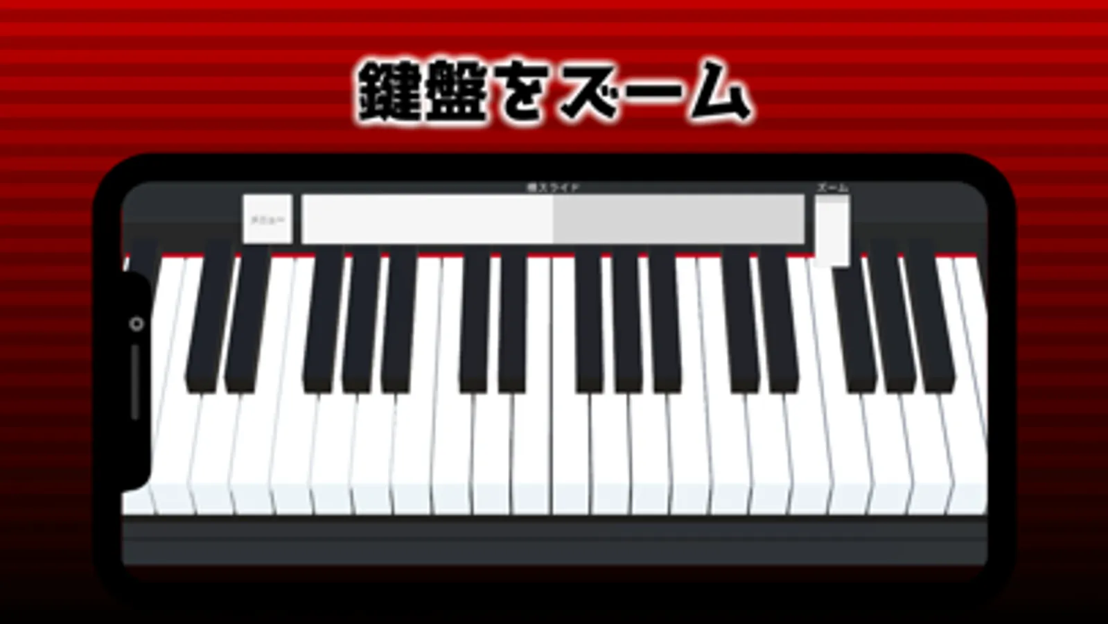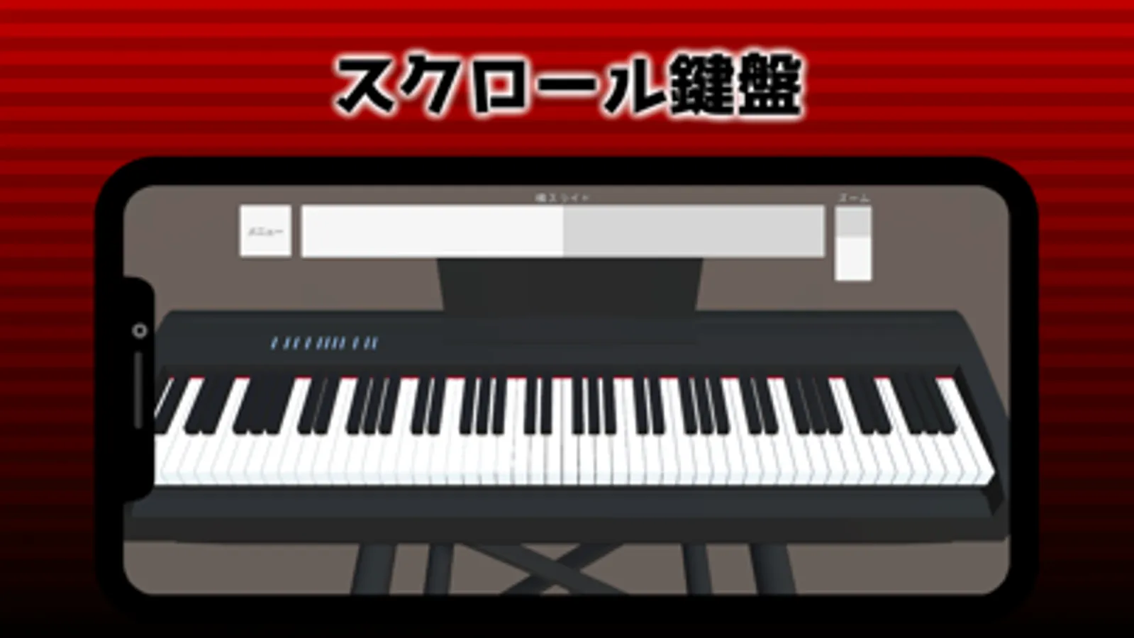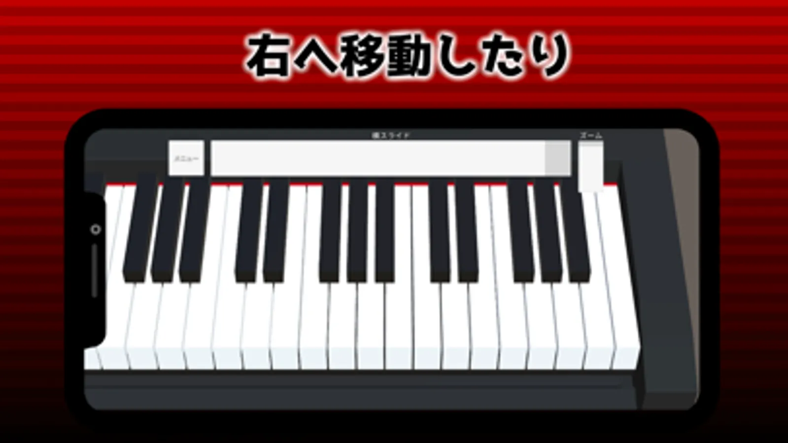 ピアノの上のスクロールバーをスライドすることで、左右に移動できます。鍵盤の同時押し対応。