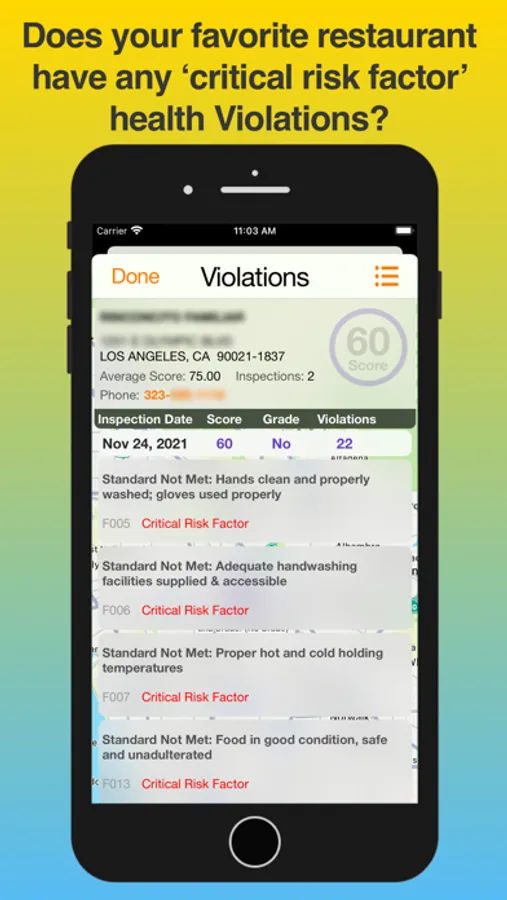 • Dig deep into the details for each restaurants violations for both the current and past health inspections.