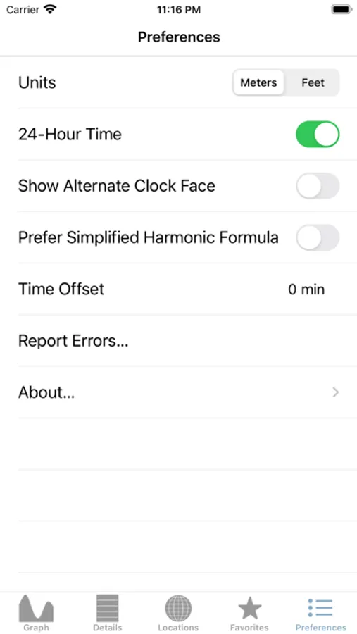 Date Picker, Moon Phase, Sunrise, Sunset, built-in offline map, GPS location detection, favorite locations, feet/meter support, 24-hour mode, and manual time adjustment.