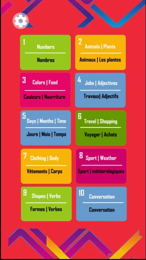 This app is suited for all ages and presents a variety of topics in both in French and English. The goal of the app is to practice common words and everyday phrases. The topics cover: