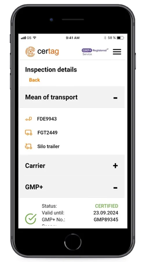 Certag mobile app is a tool recommended by GMP+ International, dedicated to GMP+ certified carriers and their clients. It was created to support transparency and feed fraud prevention in the GMP+ supply chain. It provides GMP+ certified carriers and their clients with simple and easy to use tools to plan, record, authenticate, and to inspect transport of feed.
