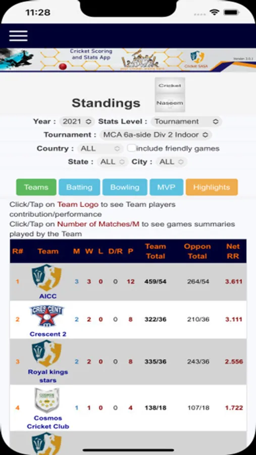 Cricket SASA, Not only provides a tool to score online but also keeps stats of leagues. There are various reports available to filter these stats which will help players, teams to track their progress. These stats filter can be helpful for club administrators / selectors to analyze players performances in given time period.