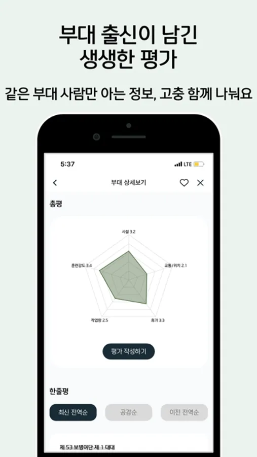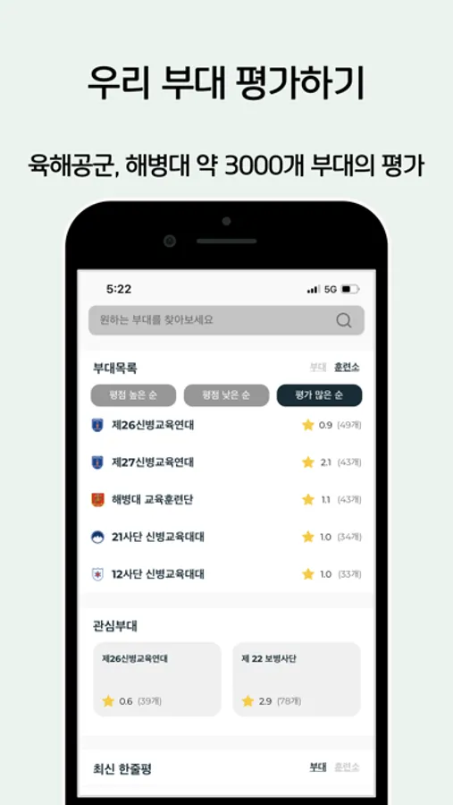- 부대 평가: 육군, 공군, 해군, 해병대 부대별 평가 작성하거나 다른 사람들의 평가를 볼 수 있어요