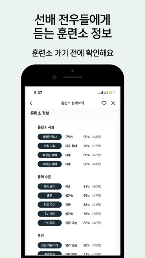- 훈련소 평가: 육군, 공군, 해군, 해병대 훈련소 평가를 작성하거나 다른 사람들의 평가를 볼 수 있어요
