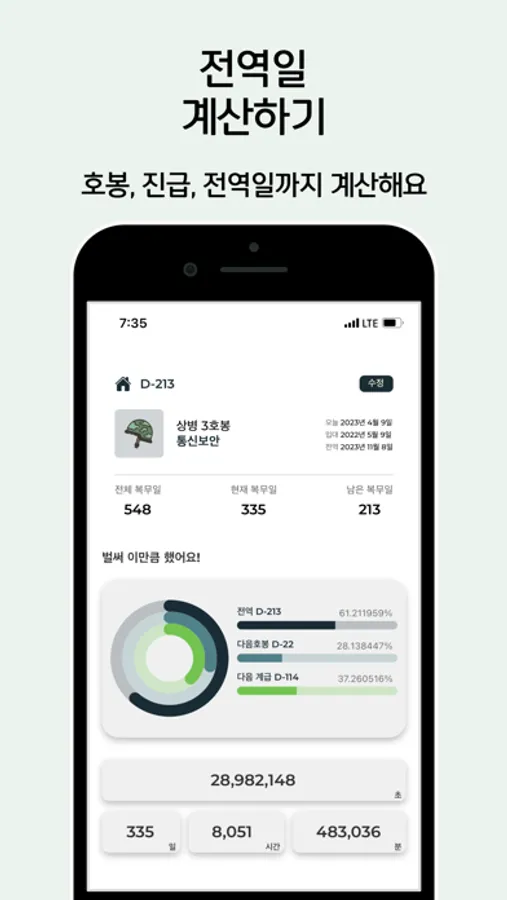 - 전역일 계산기: 실시간으로 남은 복무일, 다음 호봉일, 다음 진급일을 확인해요