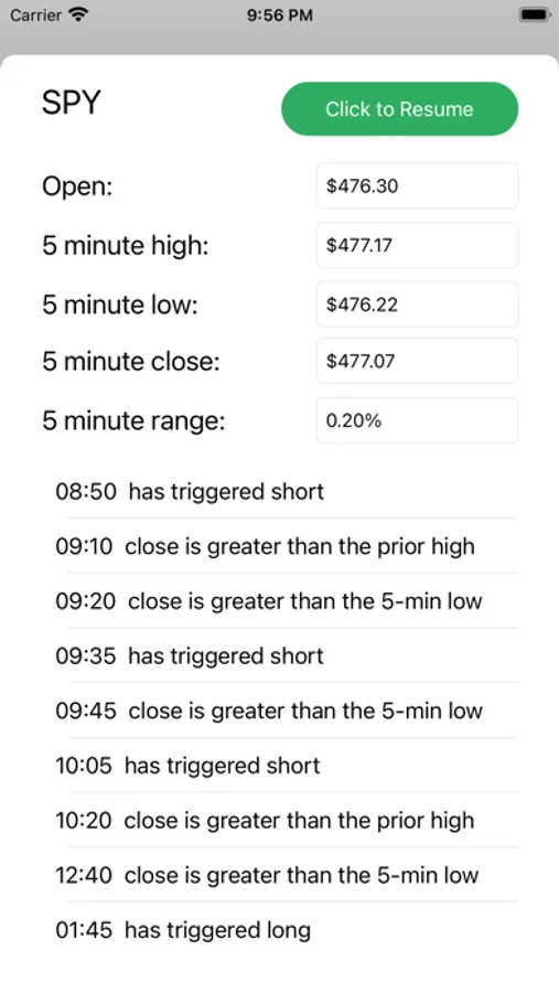 The 5 Min Stock Rule app is based on a 5 minute rule strategy and trade signals based on the stock’s 5 minute chart. Once the user selects a group of stocks from the US financial markets, the app sets a high and low level based on the high and low achieved after the first five minutes of the trading session. If a subsequent candle is completely above that first five minute high, the app signals the user to go long and buy the stock. If, however, a subsequent candle is completely below that first five minute low, the app signals the user to short the stock