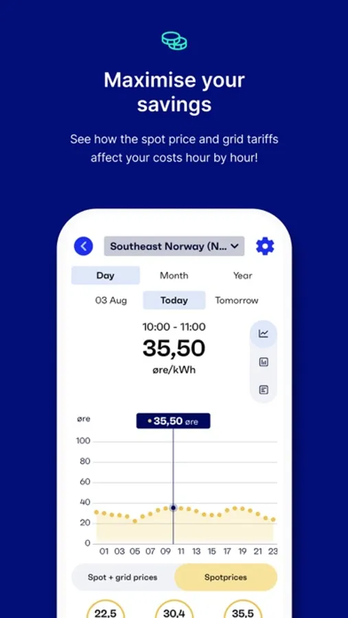 - Get notifications when you should avoid using a lot of energy. You can choose to receive a daily notification when the spot price is the cheapest and most expensive during the day.