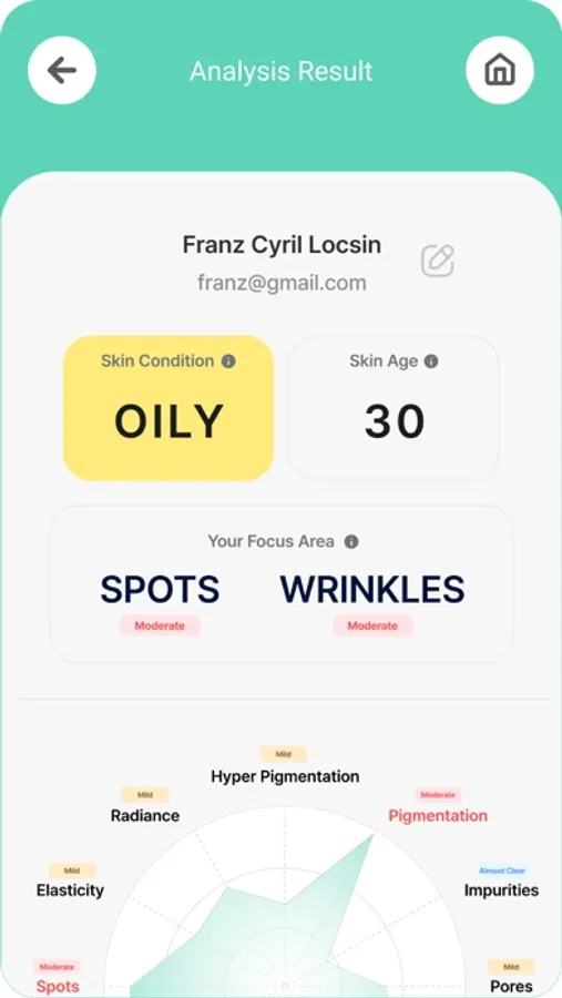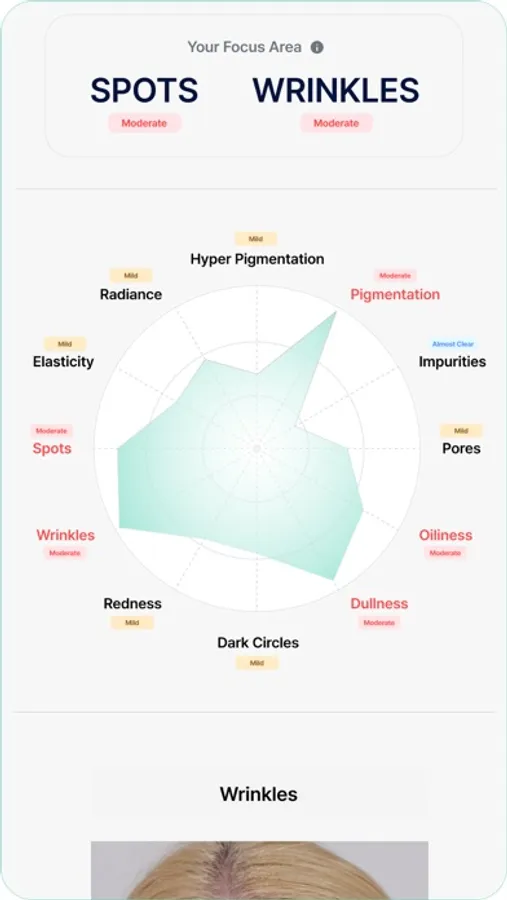 Our easy-to-use APP allows a user to take three facial images from different angles with the help of an audio guide for proper image capturing. Text guidelines are also available to help users navigate through the app smoothly. Captured images are processed by our AI and algorithm, and results are shown in simple graphs and wordings for easy understanding.