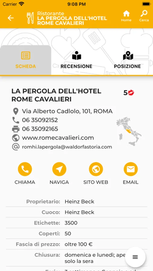 Regione per regione, splendide scoperte e conferme, grandi e piccoli ristoranti italiani ai quali abbiamo dato i nostri due, tre, quattro, cinque baci. I ristoranti selezionati da Bibenda vengono pubblicati con tutte le notizie utili per raggiungerli e ricerca geografica, oltre alla descrizione, tutti i dati del locale, giorni di apertura, chef, prezzo. Inoltre, una nota di cortesia per indicare al lettore una chicca, una produzione di nicchia, un suggerimento, una bottega da non perdere negli immediati paraggi del ristorante, per rendere la visita ancor più interessante.