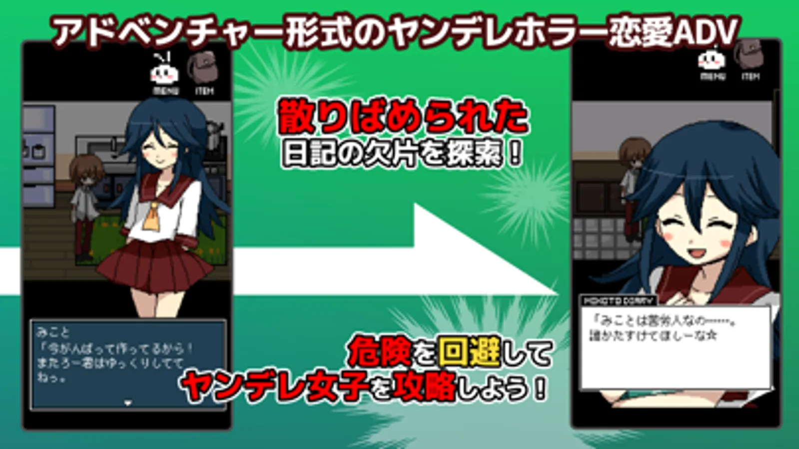心理的な恐怖: 交換日記の過程で、少女の鬱症状や不気味な出来事についての詳細が明らかになっていきます。プレイヤーは少女の心の闇に触れることで、緊張感や不安感を感じることができます。物語が進むにつれて、プレイヤー自身も少女とのつながりを感じながら、不気味な出来事に巻き込まれることで怖さが増します。