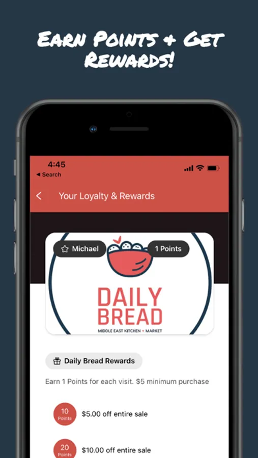 The Daily Bread app is a convenient way to pay in-store or skip the line and order ahead. Rewards are built right in, so you'll collect Stars and start earning free food and drinks with every purchase.