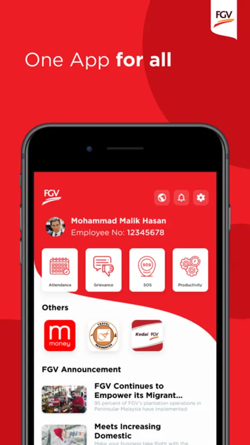 The FGV App, powered by Merchantrade Asia Sdn Bhd, is a one-stop app for employees to easily manage daily activities such as record daily attendance, lodge any work-related grievances, and seek help through the SOS button in case of any emergency, wherever they are.