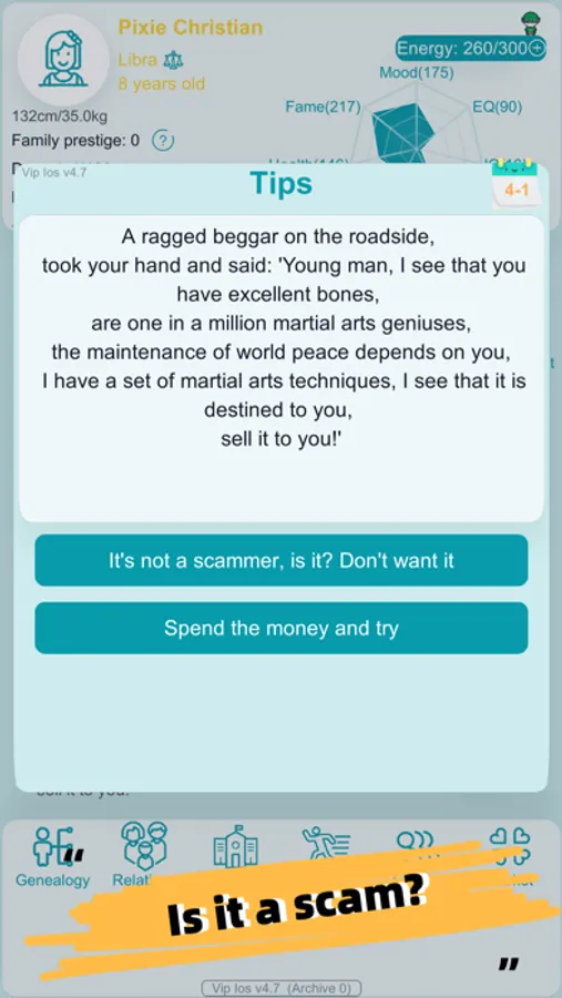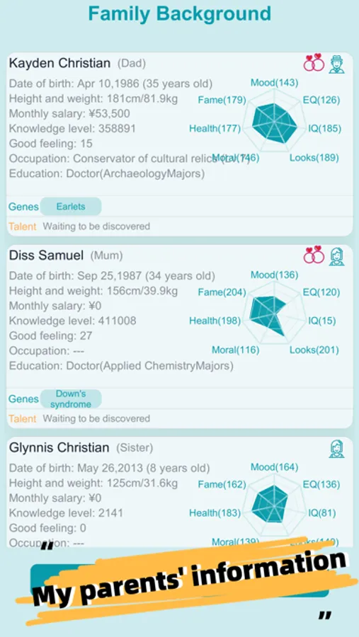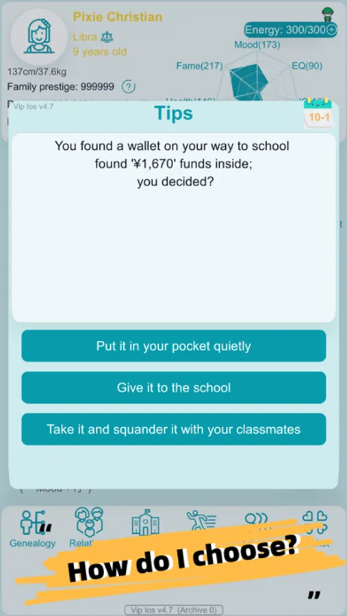 The game offers various features such as genealogy system, gambling, institute, real estate, stock market, pet system, inheritance system, cheating, homosexuality, prison, etc.