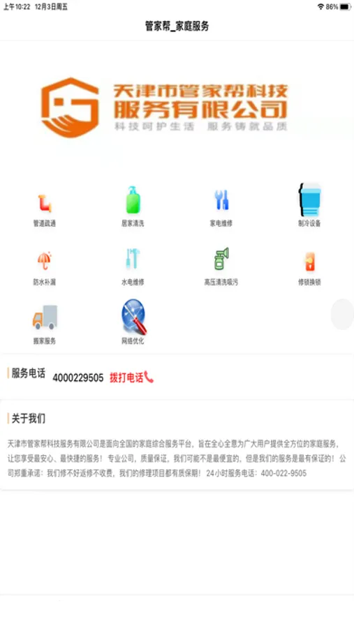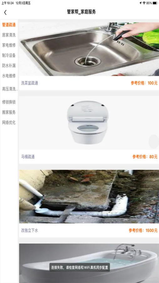 管家帮家庭服务展示;为您展示我公司的主要服务业务内容,主要大类 管道疏通 居家清洗 家电维修 制冷设备 防水补漏 水电维修 高压清洗吸污 修锁换锁 医疗转运 搬家服务 网络优化