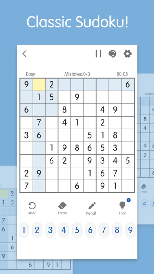 Classic Sudoku is a logic-based, number-placement puzzle in which the player needs to fill a 9*9 grid through deduction based on the given numbers. The objective is to complete a grid where each row, each column, and each of the nine 3*3 regions contains all of the digits from 1 to 9.