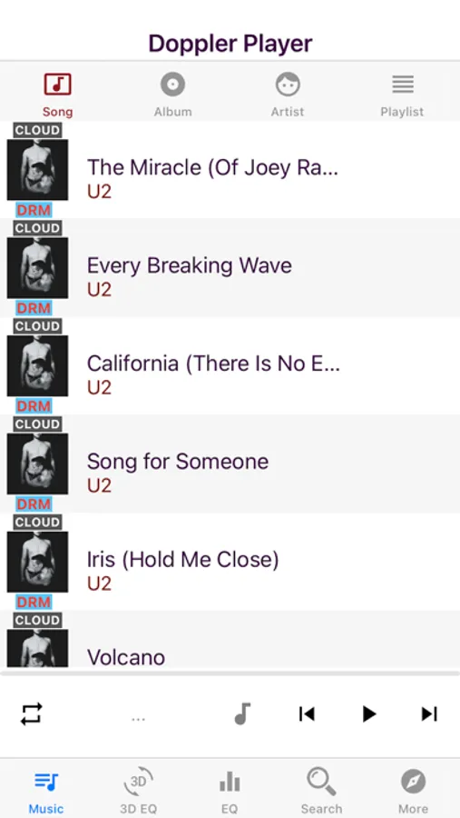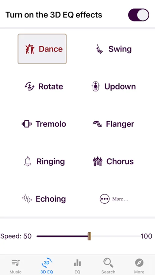 1. The built-in 3D EQ can augment the sound reality while playing. It can add customized binaural sound effects to audio. It also provides 13 reverb presets (such as Chamber, Large Hall, Cathedral) and 22 distortion presets (such as Drums Bit Brush, Decimated, Echo). The user can change the settings while playing. For each 3D EQ presets, user is allowed to fine tune the effect by adjusting the delay, speed, etc. This feature applies only to local audio files without Digital Rights Management (DRM).