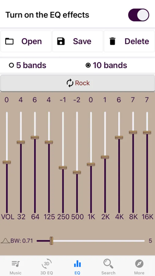 2. The built-in EQ provides 17 presets (such as Full Bass, Rock, Jazz, Classic, Vocal). Users can fine tune and save the EQ (5-band or 10-band) setting they like. Users can also choose the predefined and self-defined EQ settings while playing. For each EQ presets, user is allowed to fine tune the effect by adjusting bandwidth and gain. This feature applies only to local audio files without Digital Rights Management (DRM).
