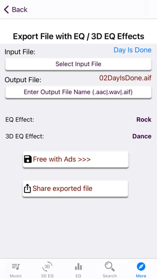 3. Users not only can enjoy the EQ and 3D EQ effects while playing, they also can export the audio files with built-in EQ and 3D EQ effects. After audio is exported, users can choose to save the audio files locally or share them with friends. When playing the exported audio file using this player, use may want to turn off the 3D EQ or EQ effect, otherwise it will be played with double effects.