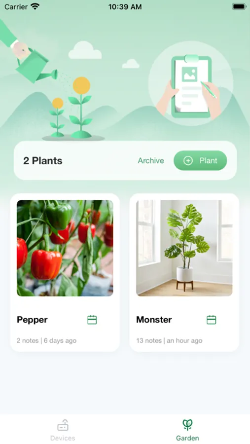 Create a Plant Diary to help record the status of your plants, by adding photos and scheduling plant care events.