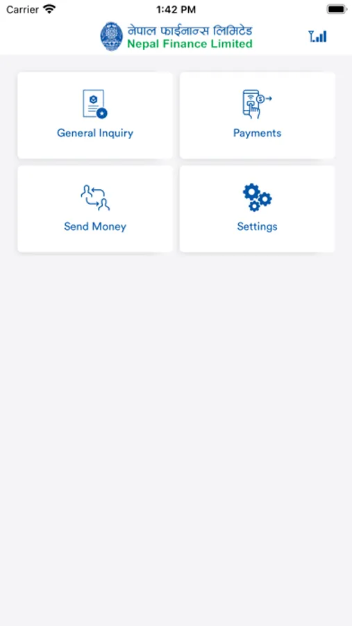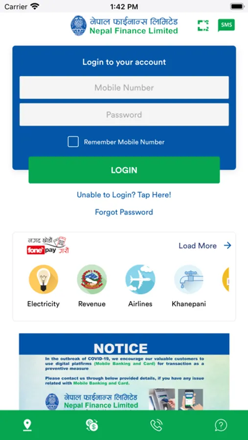 To be able to use this App, you first need to have a valid account maintained at Nepal Finance Limited, and you need to subscribe to the Nepal Finance Limited's Mobile Banking Service.