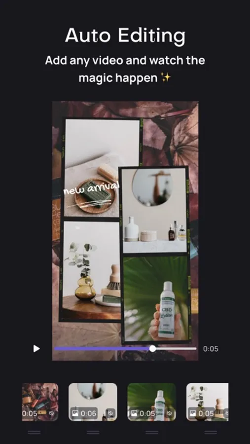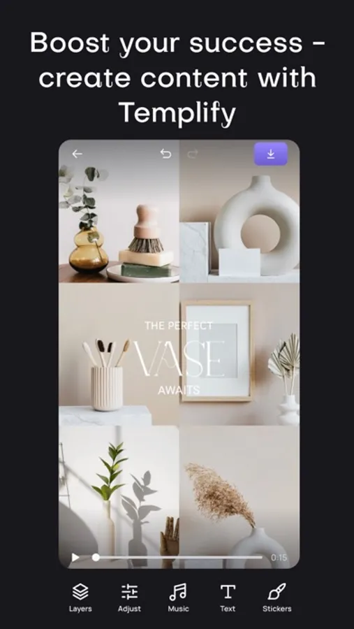 Choose a template, Add your videos and photos, pick a song and export.Your video is ready to be shared on any social network.
