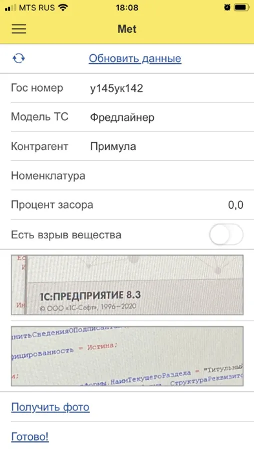 Рабочее место мастера участка Втормет. Приложение предназначено для служебных целей. Есть база на сервере, в которой находится информация о прибывшей на разгрузку машине с металлоломом, категории лома, которые используются в организации. Мастер участка с установленным приложением IMH Vtormet , обновляет данные на телефоне, выбирает из имеющихся в списке номеров нужный гос. номер машины, фотографирует содержимое, делает пометки о безопасности лома и о содержащейся категории лома. Данные попадают в оформляемый ПСА у оператора на участке.