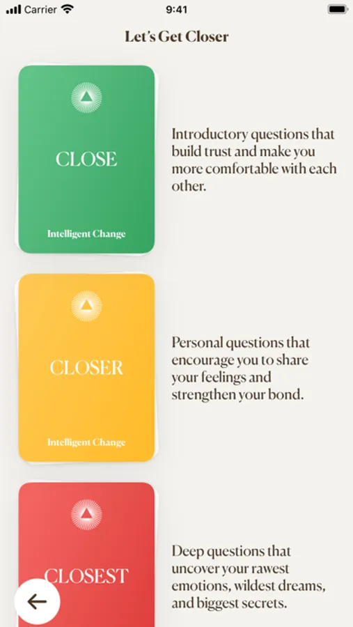 - Questions are separated into three levels: Close, Closer, Closest. Each progressive level poses questions that become more personal, challenging players to share and strengthen their bond.