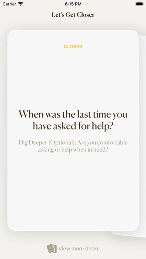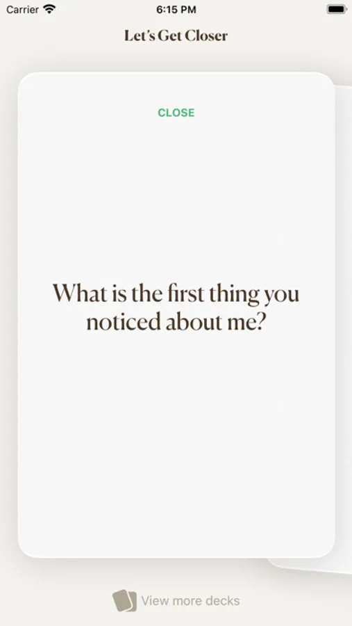 - Beautifully designed game experience: The Let’s Get Closer App has been designed to capture the physical experience of Let’s Get Closer card game. Getting around the app is a breeze and selecting questions is simple.
