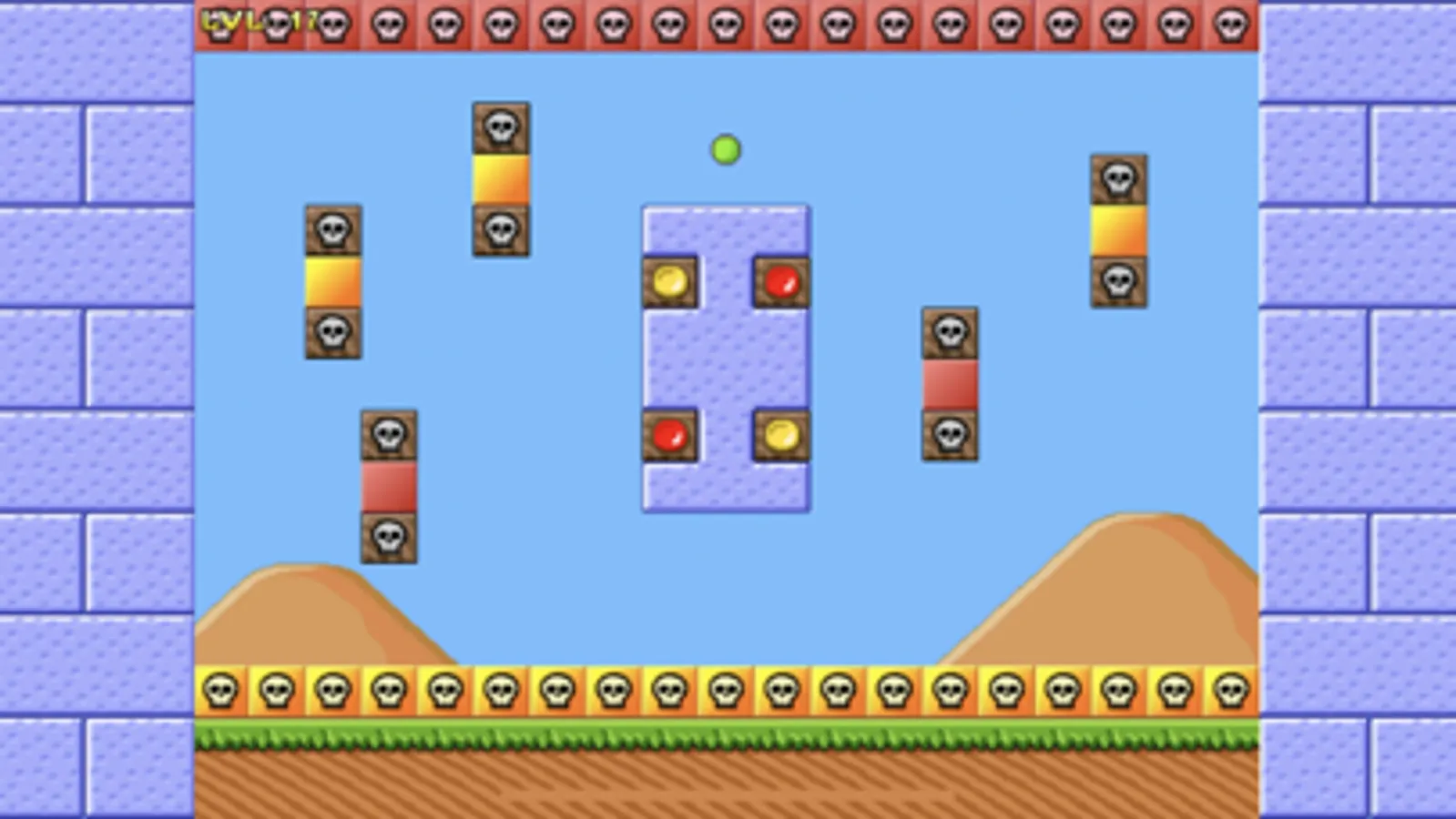 Each of the game's 30 play fields consists of a number of different colored blocks. Your goal is to remove them all by changing your ball's to the matching color.
