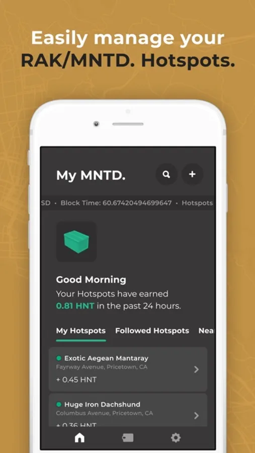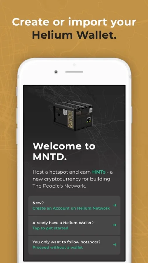 The MNTD. App is a secure, smartphone app for onboarding and setup of your MNTD. and RAK Hotspots. It allows you to easily manage your Helium (HNT) balance and to monitor your token earnings.