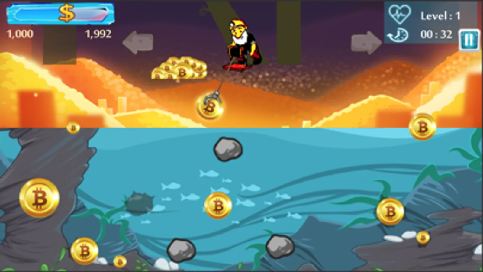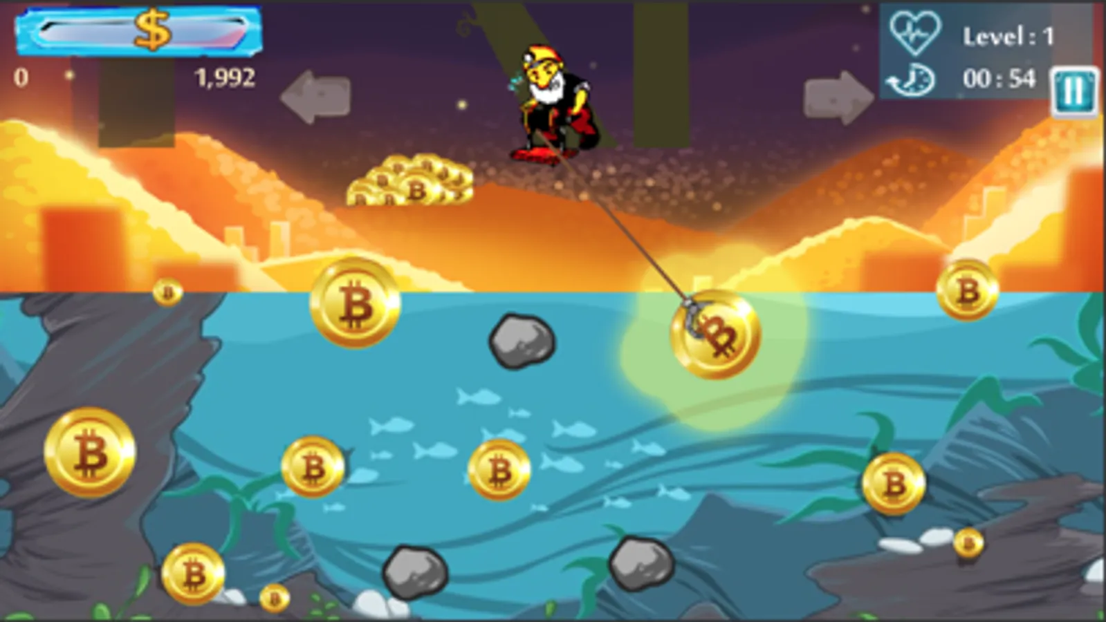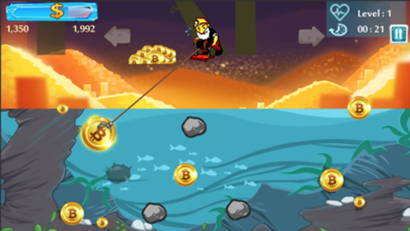 Aim on the coin while the hook swings, and click on the screen to release the hook and collect the coins in Mining Crypto Game to achieve your goal and earn enough coins to pass the level.