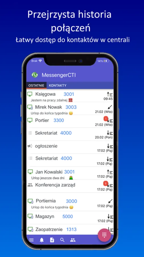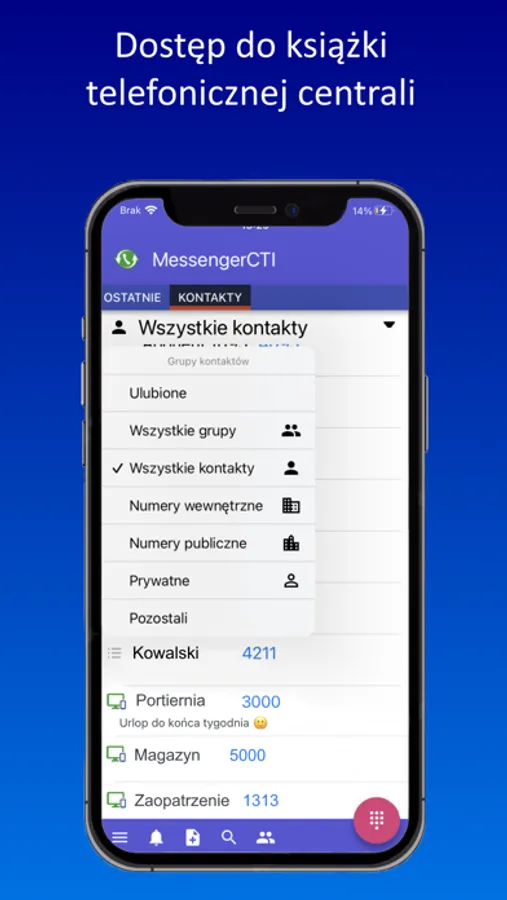 - Lista kontaktów z podglądem stanu dostępności abonenta (czata, zajętości telefonu, opis)