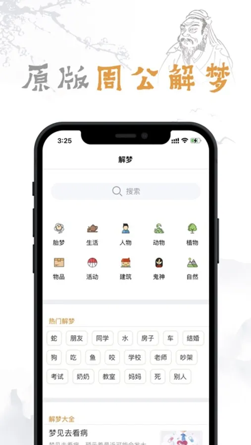 6、 周公解梦分类大全:包含胎梦人物、动物、鬼神等10大类一共2万多条周公解梦,2345周公解梦大全。