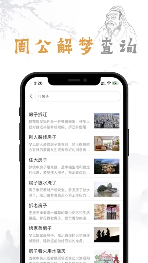 1、 周公解梦大全搜索功能:输入简单关键字便可周公解梦。如:梦到蛇,梦见怀孕,梦到蛇,梦见牙齿,梦到拣钱,梦到考试;