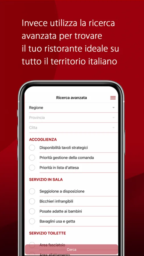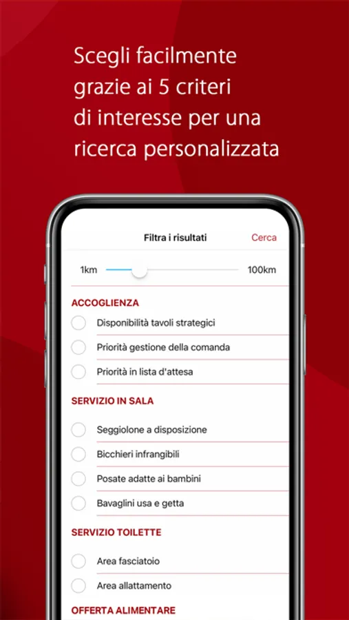 Attivando la ricerca personalizzata e selezionando i criteri di valutazione per voi di maggiore interesse, potrete effettuare una ricerca altamente personalizzata e trovare il locale che più rispecchia le vostre necessità.