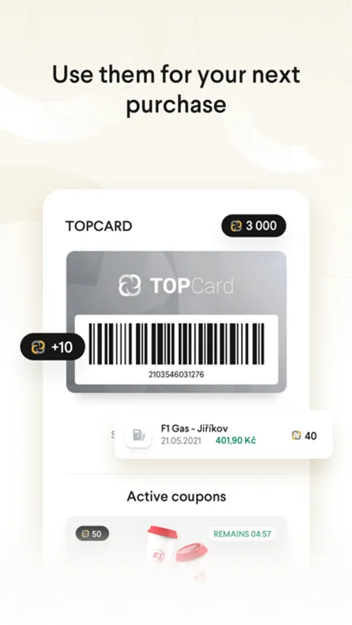 Just use TOPCard like a usual payment card. 1 point equals 1 CZK. If you have earned 100 points, you can pay for a purchase worth 100 CZK. You get cashback points on your purchase paid with TOPCard.