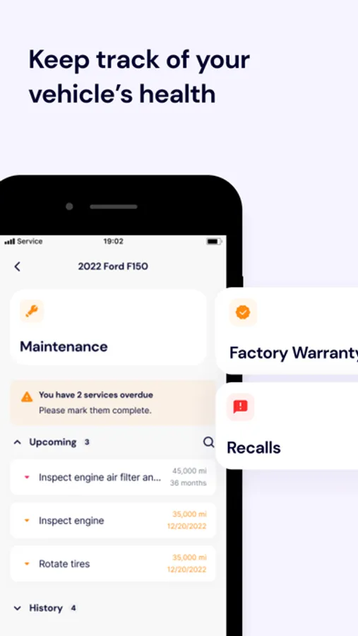 Monitor the status of your vehicle’s Factory Warranty information and access OEM manuals in-app.