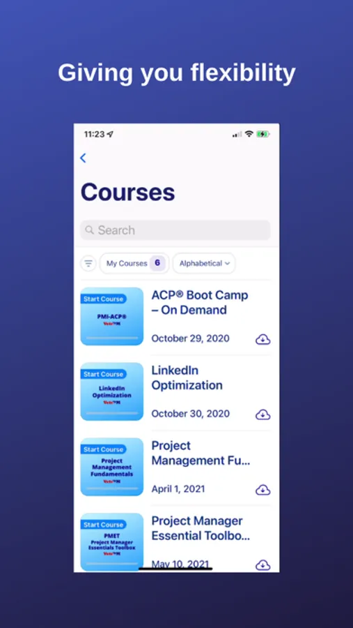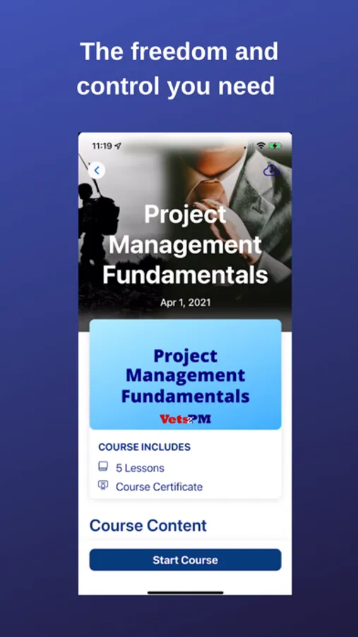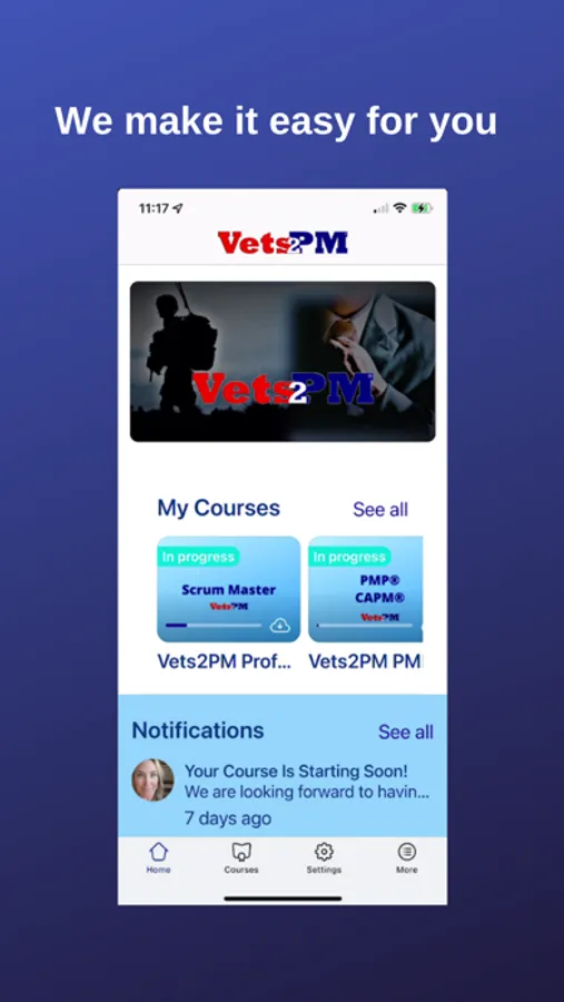 The Vets2PM app will allow you to view your enrolled Courses and Resources from your mobile device. You will also be able to contact Vets2PM, receive important notifications from the Vets2PM team, make adjustments to your user settings, access your completed course certificates, check status of your courses, etc.